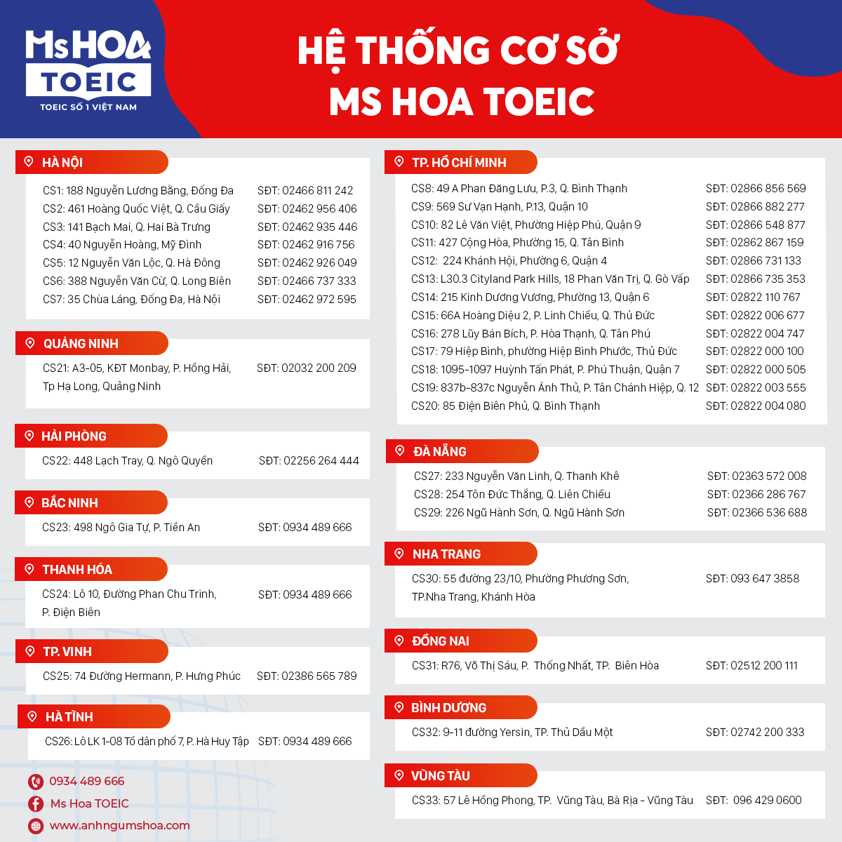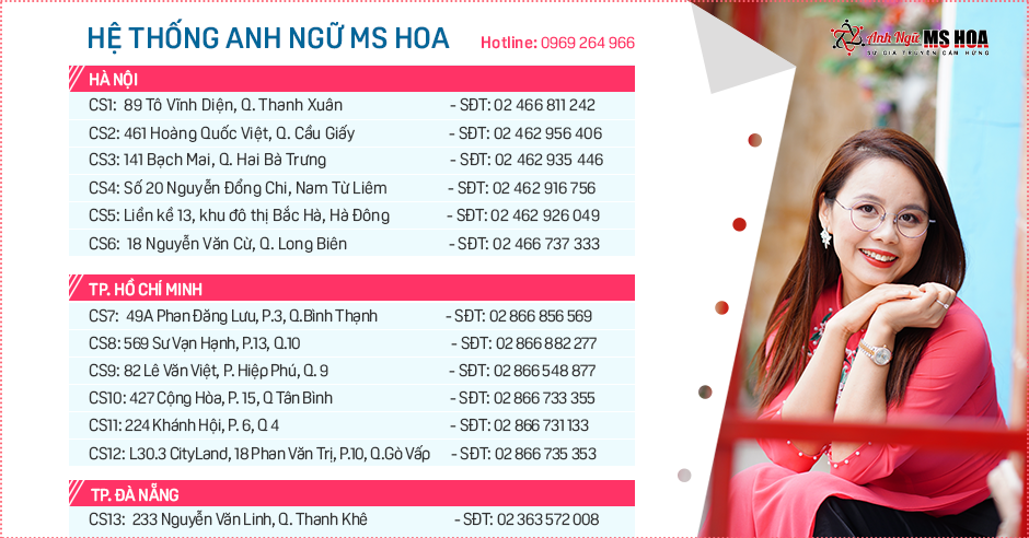 Anh Ngữ Ms Hoa là một địa chỉ học tiếng Anh rất được nhiều người tin tưởng hiện nay. Ở đây, các khóa học được thiết kế đa dạng, phù hợp với nhiều đối tượng từ người mới bắt đầu đến những bạn muốn nâng cao kỹ năng giao tiếp, luyện thi chứng chỉ hay phát triển tiếng Anh chuyên ngành.
