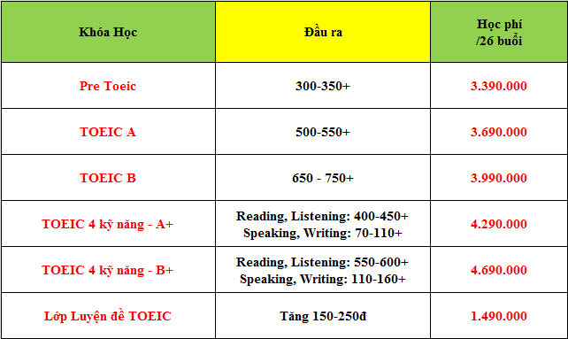 Anh ngữ Ms Hoa là một trong những trung tâm luyện thi TOEIC uy tín tại Hà Nội với mức học phí rất hợp lý, dao động từ khoảng 2.990.000 đến 4.690.000 đồng tùy vào khóa học và nhu cầu của học viên. Điều đặc biệt là trong suốt quá trình học, học viên không phải đóng thêm bất kỳ khoản phí phát sinh nào, giúp bạn yên tâm tập trung học tập.