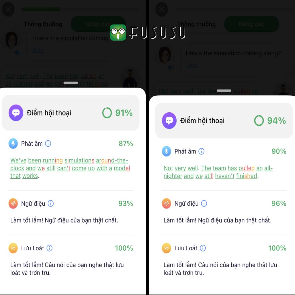Khi luyện nói, ELSA sẽ sử dụng màu sắc minh họa, giúp bạn dễ dàng nhận biết được phần phát âm đúng và sai. Ngoài ra, độ tương tác của ứng dụng cũng khiến quá trình học trở nên thú vị hơn. Bạn có thể luyện tập với nhân vật ảo và cảm nhận được sự tiến bộ của bản thân qua từng bài luyện.