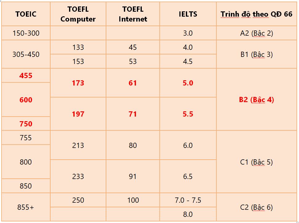 Ngoài IELTS, trình độ B1 cũng có thể được quy đổi sang các chứng chỉ khác như TOEIC với điểm số từ 450 đến 550. Như vậy, nếu bạn đang nhắm đến chứng chỉ tiếng Anh B1, biết được rằng nó tương đương với khoảng 4.0 đến 4.5 điểm IELTS sẽ giúp bạn định hướng và ôn luyện hiệu quả hơn cho mục tiêu của mình.