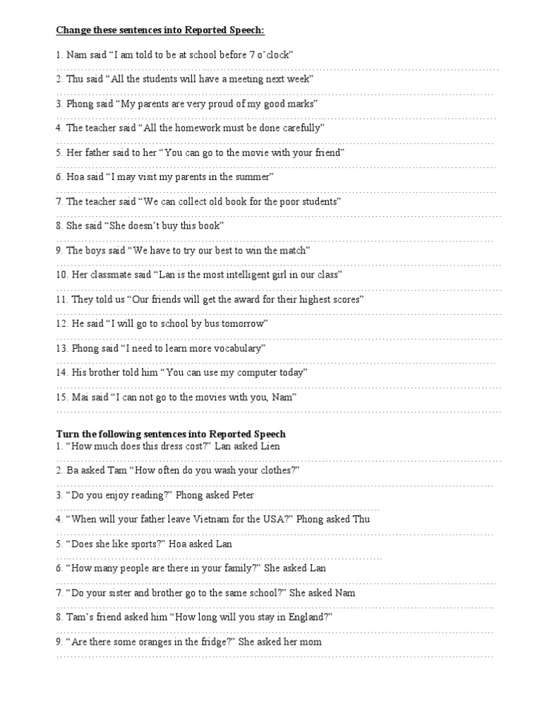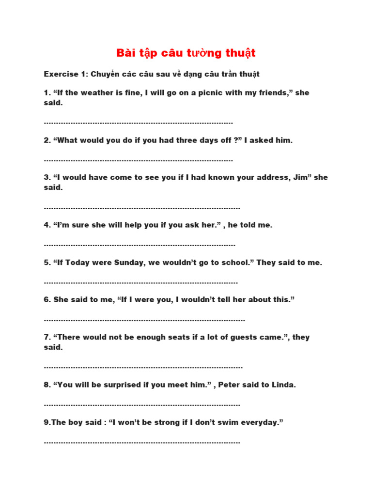 Để ôn tập hiệu quả, học sinh có thể tham khảo các bài tập về câu tường thuật. Có rất nhiều tài liệu, từ cơ bản đến nâng cao, giúp bạn thực hành và cải thiện kỹ năng chuyển đổi câu. Tổng hợp các bài tập cùng đáp án chi tiết cũng là một cách tốt để học tập một cách tự nhiên và hiệu quả hơn.