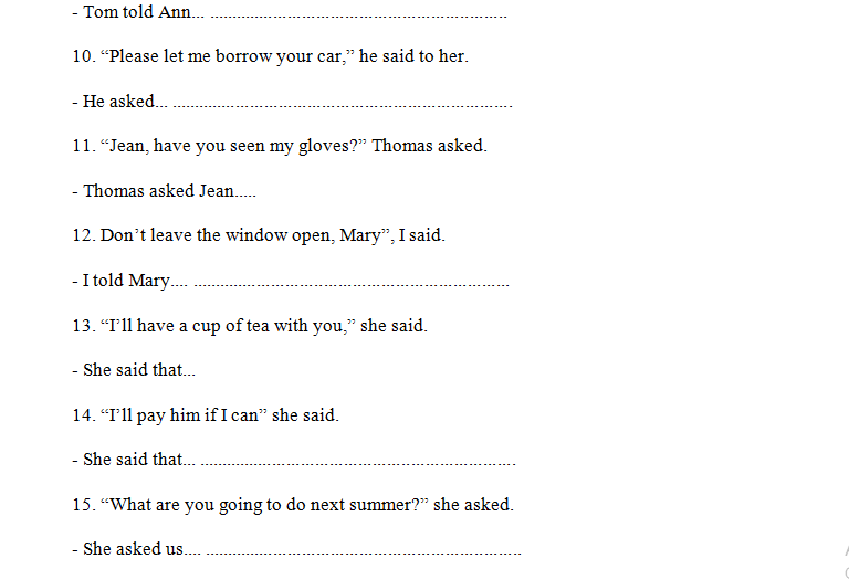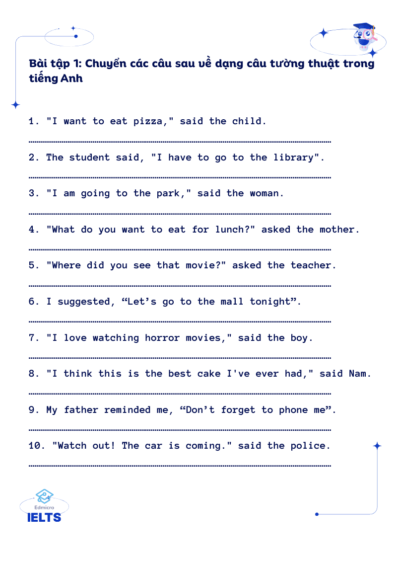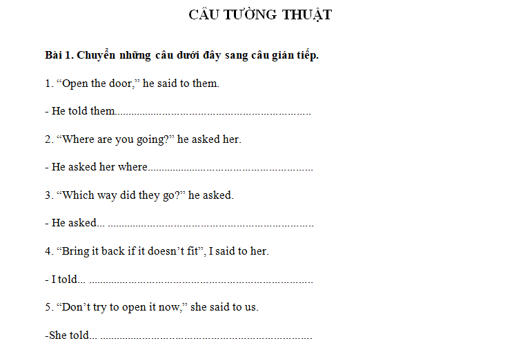Khi học sinh thực hành bài tập câu tường thuật, việc nắm vững cấu trúc và các động từ tường thuật sẽ giúp các em tự tin hơn trong việc giao tiếp. Các dạng bài tập cũng rất đa dạng, từ câu kể, câu mệnh lệnh đến câu đề nghị, giúp các em rèn luyện kỹ năng một cách toàn diện. Hãy thử sức với những bài tập này để cải thiện khả năng sử dụng tiếng Anh của mình nhé!