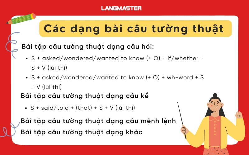 Ngoài dạng câu kể, còn có câu hỏi và câu mệnh lệnh cũng là những cấu trúc tường thuật quan trọng. Việc sử dụng đúng các dạng câu này không chỉ giúp cải thiện kỹ năng giao tiếp mà còn tạo ra những cuộc trò chuyện sinh động và thú vị hơn. Hãy cùng nhau luyện tập để nắm vững kiến thức này nhé!