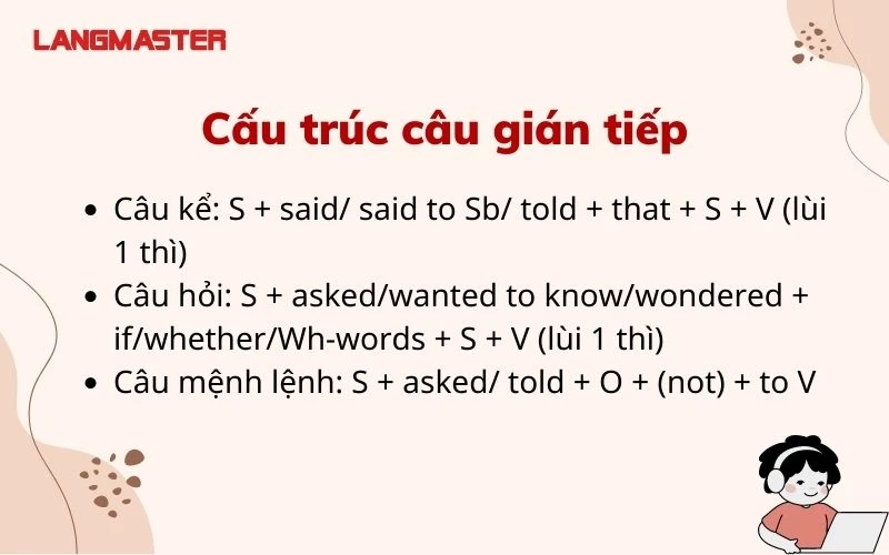 Câu tường thuật (reported speech) là một phần ngữ pháp quan trọng trong tiếng Anh, giúp chúng ta thuật lại lời nói hoặc quan điểm của người khác một cách gián tiếp. Trong các dạng câu tường thuật, câu kể là dạng phổ biến nhất. Cấu trúc của câu tường thuật dạng câu kể được xây dựng bằng cách sử dụng động từ nói như “say” hoặc “tell”, theo sau là nội dung lời nói đã được thay đổi.