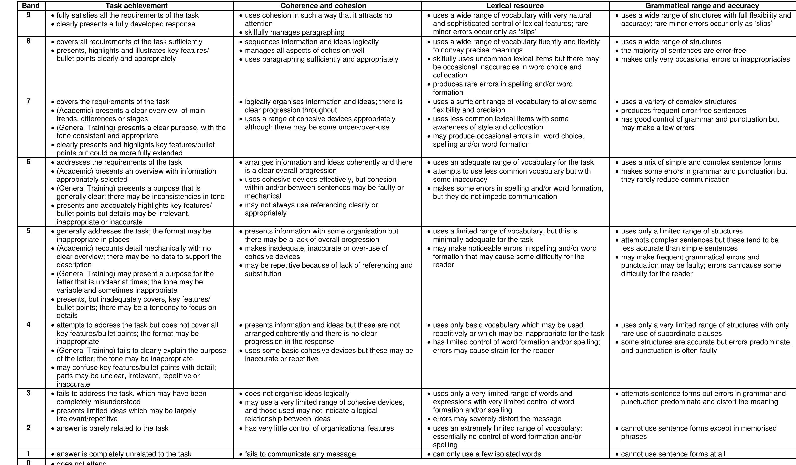 IELTS Writing Band Descriptors là một công cụ quan trọng giúp thí sinh hiểu rõ cách mà giám khảo đánh giá bài viết của mình trong kỳ thi IELTS. Bảng mô tả này chia thành bốn tiêu chí chính: Task Achievement, Coherence and Cohesion, Lexical Resource và Grammatical Range and Accuracy. Mỗi tiêu chí đóng góp một phần 25% vào tổng điểm, vì thế việc nắm vững từng tiêu chí là rất cần thiết.