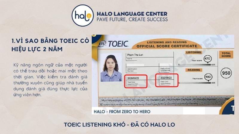 Tuy nhiên, sau 2 năm, chứng chỉ TOEIC của bạn sẽ hết hiệu lực. Điều này có nghĩa là nếu bạn không thi lại để có chứng chỉ mới, kết quả của bạn sẽ không được chấp nhận khi bạn cần nộp hồ sơ. Nguyên tắc này được áp dụng để đảm bảo rằng kỹ năng ngôn ngữ của người học luôn được cải thiện và cập nhật, đặc biệt khi không thường xuyên sử dụng tiếng Anh.