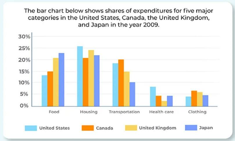 Một bài viết chuẩn thường gồm ba phần: mở bài, tổng quan và các chi tiết chính. Ở phần mở bài, bạn chỉ cần diễn giải lại đề bài bằng cách dùng từ đồng nghĩa và cấu trúc khác, ví dụ như “The bar chart illustrates…” hay “The graph compares…”. Phần tổng quan nên tóm tắt những đặc điểm chính của biểu đồ, như xu hướng chung hay điểm nổi bật nhất, mà không cần đưa số liệu cụ thể. Cuối cùng, phần thân bài sẽ trình bày chi tiết hơn về các số liệu quan trọng, so sánh sự khác biệt giữa các nhóm hoặc thời điểm.