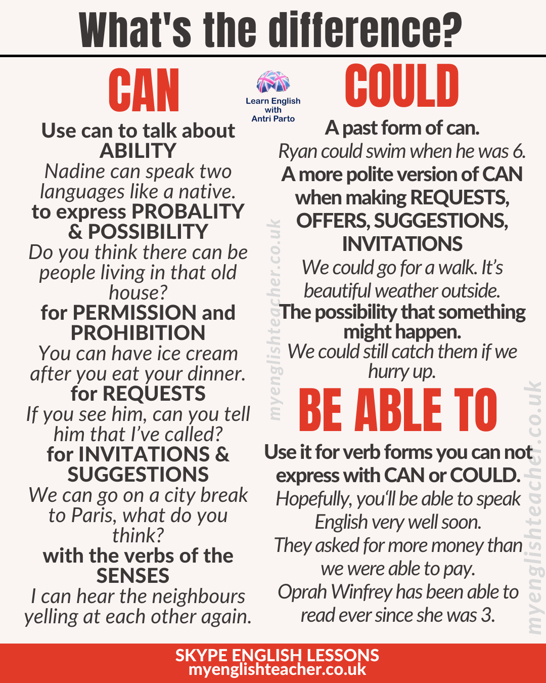Trong tiếng Anh, “can”, “could” và “be able to” đều mang nghĩa là “có thể”, nhưng chúng có những cách dùng khác nhau. “Can” thường được sử dụng để chỉ khả năng hoặc sự cho phép trong hiện tại, ví dụ như “I can swim” (Tôi có thể bơi). Ngược lại, “could” chủ yếu được dùng để diễn tả khả năng trong quá khứ, chẳng hạn như “I could swim when I was a child” (Tôi có thể bơi khi còn nhỏ).
