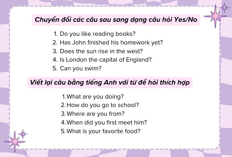 Trong quá trình học tiếng Anh, việc nắm vững các câu hỏi đóng vai trò quan trọng giúp bạn tự tin giao tiếp và đạt kết quả tốt trong học tập. Có rất nhiều loại câu hỏi trong tiếng Anh phù hợp với từng mục đích khác nhau, từ giao tiếp hàng ngày đến các dạng bài kiểm tra ở trường học. Bài viết dưới đây sẽ giúp bạn tổng hợp các câu hỏi trong tiếng Anh thông dụng, những mẫu câu hỏi giao tiếp phổ biến, cũng như các loại câu hỏi cơ bản dành cho học sinh lớp 3, 4, 5. Hãy cùng khám phá các cấu trúc và kiểu câu hỏi tiếng Anh để nâng cao kỹ năng ngôn ngữ của mình nhé!