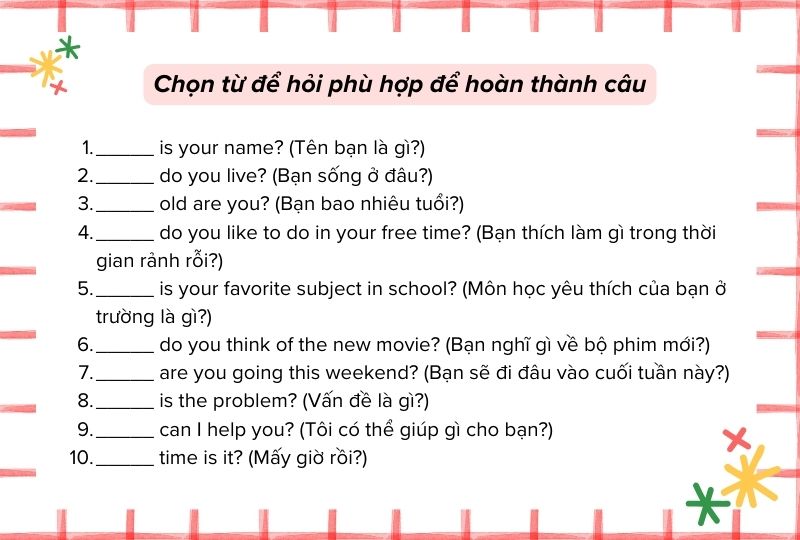 Ngoài ra, cũng có nhiều câu hỏi cơ bản sử dụng các từ để hỏi như “What’s your name?” (Tên của bạn là gì?) hay “How old are you?” (Bạn bao nhiêu tuổi?). Những câu hỏi này không chỉ giúp giao tiếp tốt hơn mà còn tạo cơ hội để hiểu thêm về người khác.