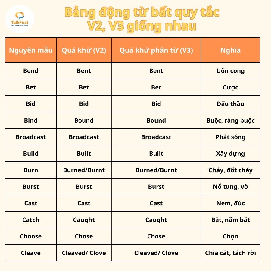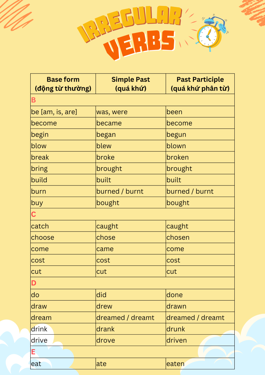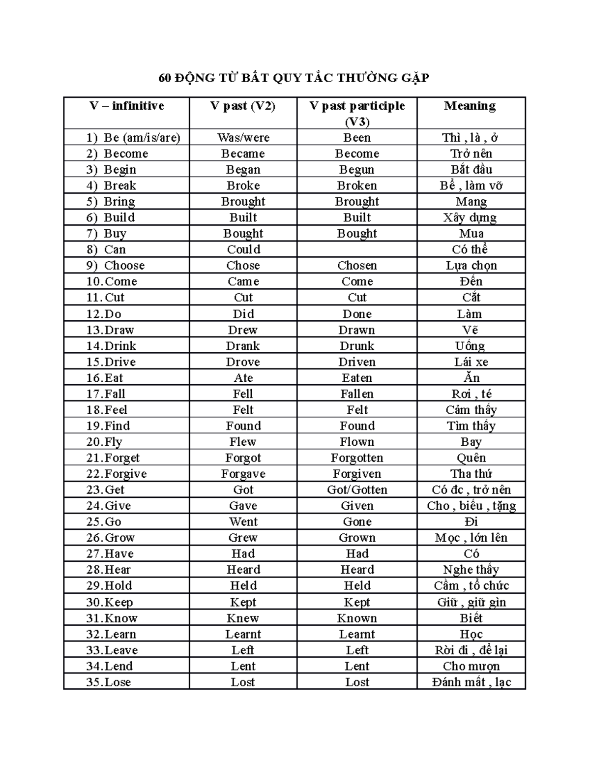 Bảng Các Động Từ Bất Quy Tắc Thông Dụng