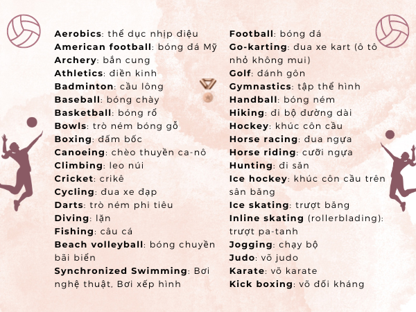 Trong tiếng Anh, có rất nhiều từ vựng liên quan đến các môn thể thao thú vị. Một số môn thể thao phổ biến mà bạn có thể gặp là soccer (bóng đá), basketball (bóng rổ), và tennis (quần vợt). Những môn này không chỉ thu hút người chơi mà còn là nguồn cảm hứng cho hàng triệu người hâm mộ trên khắp thế giới.