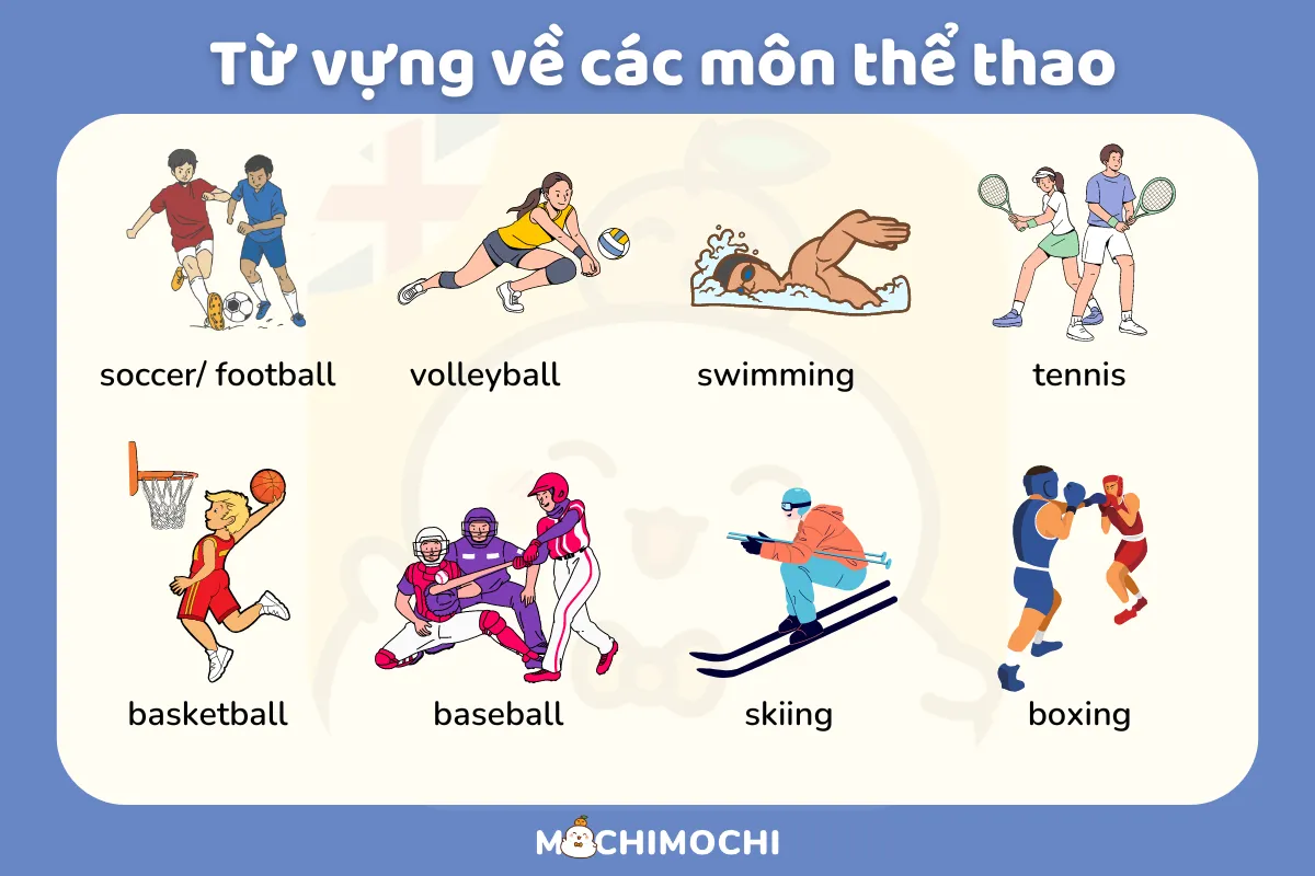 Khi nhắc đến các môn thể thao, từ vựng tiếng Anh rất phong phú và đa dạng. Một số môn thể thao phổ biến có thể kể đến như football (bóng đá) hay soccer, basketball (bóng rổ), và tennis (quần vợt). Mỗi môn thể thao đều có những quy định và lối chơi đặc trưng riêng, tạo ra sự hấp dẫn và hào hứng cho người chơi lẫn khán giả.