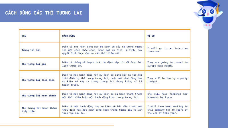 Trong tiếng Anh, các thì tương lai đóng vai trò vô cùng quan trọng giúp diễn đạt những sự việc sẽ xảy ra. Việc nắm vững các thì tương lai không chỉ giúp bạn giao tiếp lưu loát mà còn làm các bài tập ngữ pháp chính xác hơn. Mỗi thì tương lai lại có cấu trúc, cách dùng và dấu hiệu nhận biết riêng biệt. Trong bài viết này, chúng ta sẽ cùng tìm hiểu về các thì tương lai trong tiếng Anh bao gồm: thì tương lai đơn, thì tương lai tiếp diễn, thì tương lai hoàn thành và thì tương lai hoàn thành tiếp diễn. Qua đó, bạn sẽ hiểu rõ cách dùng, dấu hiệu nhận biết cũng như luyện tập áp dụng vào thực tế.