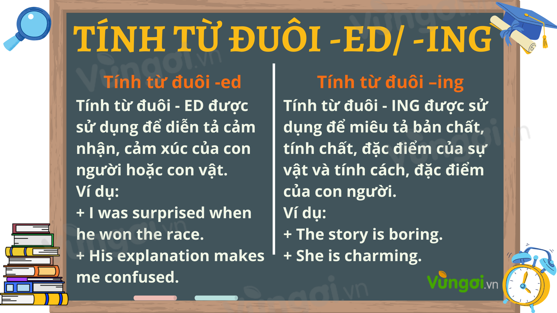 Tính từ đuôi “ed” và “ing” là những phần quan trọng trong ngữ pháp tiếng Anh, thường dùng để mô tả cảm xúc hoặc trạng thái của một vật, người hay tình huống. Những cặp tính từ này không chỉ giúp giao tiếp trở nên sinh động hơn, mà còn thể hiện rõ ràng hơn cảm xúc của người nói. Ví dụ, “bored” diễn tả cảm giác chán nản của người, trong khi “boring” lại miêu tả điều gì đó khiến người khác cảm thấy chán.
