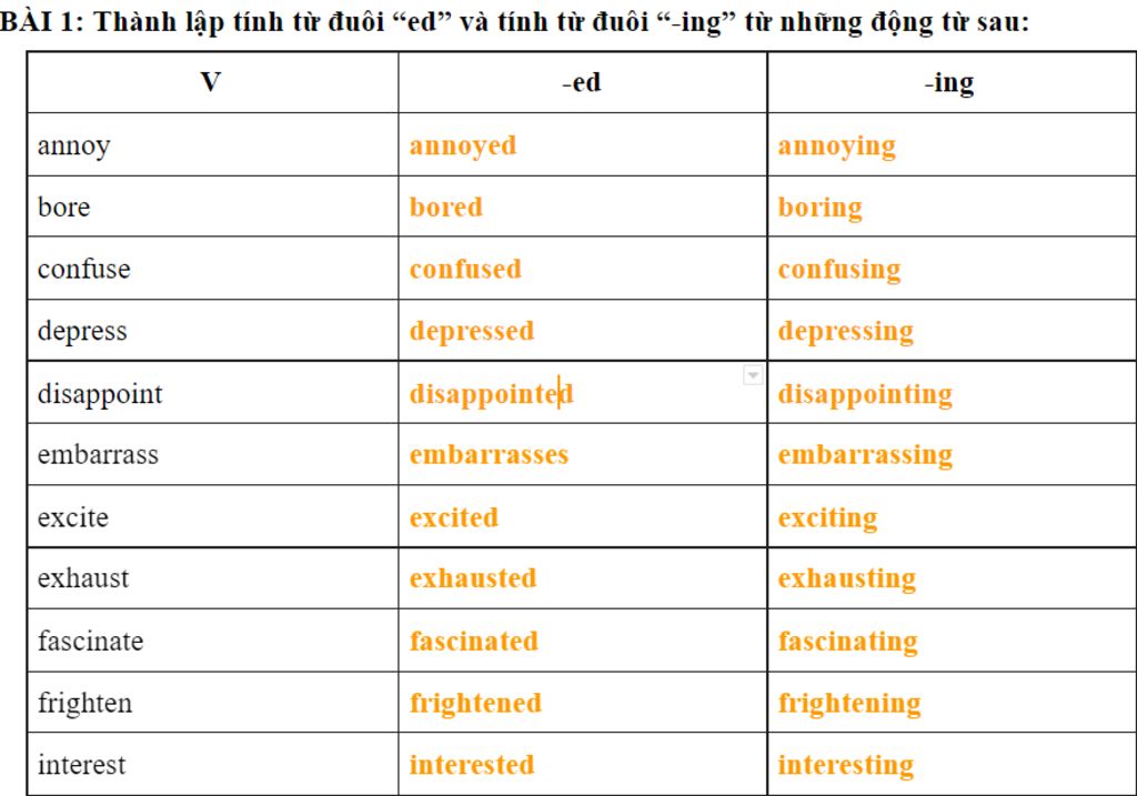 Bài tập về tính từ đuôi -ed và -ing là một phần quan trọng trong ngữ pháp tiếng Anh, giúp chúng ta phân biệt giữa cảm xúc của con người và đặc điểm của sự vật. Tính từ đuôi -ing thường được dùng để miêu tả tính chất, đặc điểm của một sự vật nào đó, như trong câu “The movie is interesting” (Bộ phim thì thú vị).