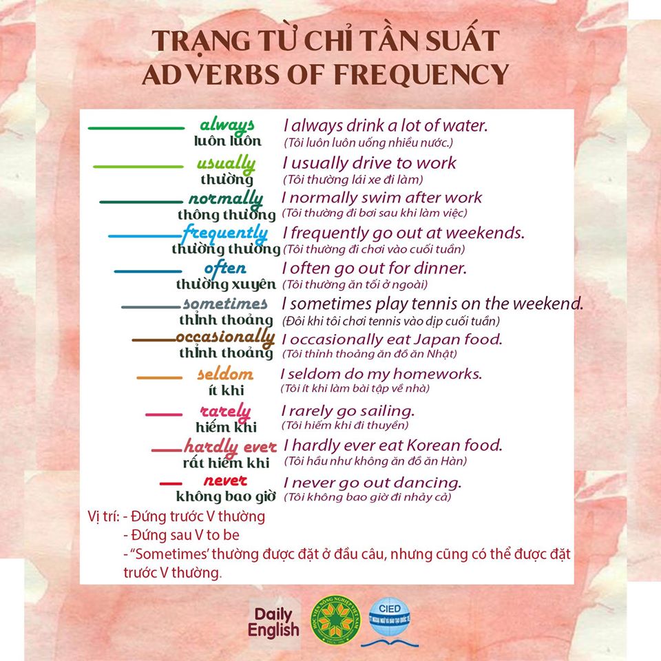 Trạng từ chỉ tần suất (Adverb of frequency) là những từ rất hữu ích trong tiếng Anh, giúp chúng ta diễn đạt mức độ thường xuyên hoặc không thường xuyên của một hành động. Những trạng từ này cung cấp cho người nghe hoặc người đọc một cái nhìn rõ ràng về tần suất của một sự kiện.