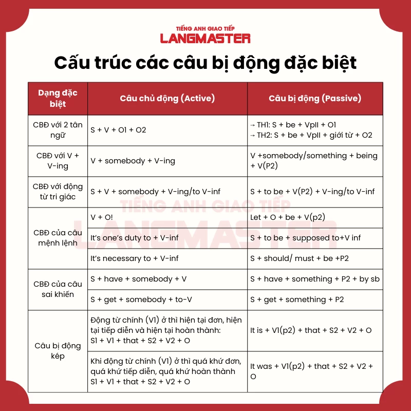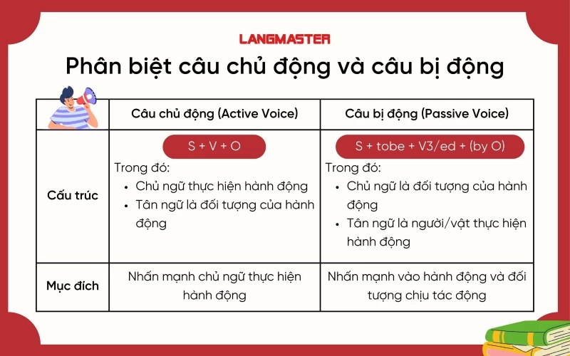 Langmaster đã tổng hợp 50 bài tập về câu bị động, từ cơ bản đến nâng cao, kèm theo lời giải chi tiết. Những bài tập này giúp người học nắm vững cách sử dụng câu bị động trong các thì khác nhau, hỗ trợ cho việc ôn tập và củng cố kiến thức. Với một loạt các ví dụ cụ thể, bạn có thể dễ dàng nhận biết và phân biệt giữa câu chủ động và câu bị động, qua đó nâng cao kỹ năng viết và nói.