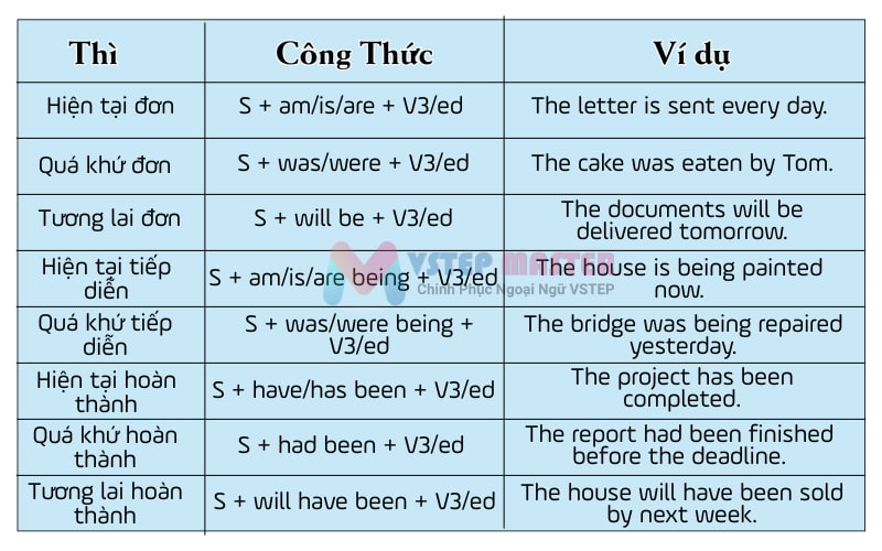 Câu bị động là một trong những cấu trúc ngữ pháp quan trọng trong tiếng Anh, giúp chúng ta hiểu cách thức mà một chủ ngữ (người hoặc vật) chịu sự tác động của hành động. Công thức chung của câu bị động là “S + be + V3/ed + (by + doer)”. Ở đây, “S” là chủ ngữ mới, thường là tân ngữ của câu chủ động, “be” là động từ “to be” được chia theo thì, và “V3/ed” là động từ ở dạng quá khứ.