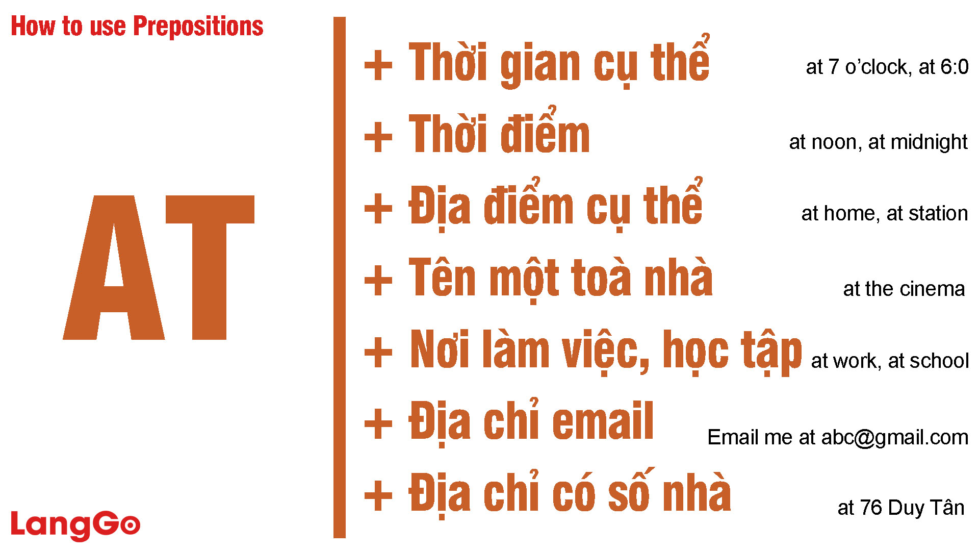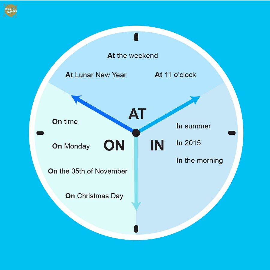 Giới từ trong tiếng Anh là một phần thiết yếu giúp câu văn trở nên rõ ràng và chính xác hơn. Có nhiều loại giới từ khác nhau, trong đó, giới từ chỉ thời gian như “at,” “on,” và “in” thường được sử dụng để diễn đạt thời điểm cụ thể. Chẳng hạn, chúng ta nói “I get up at 6.00” để chỉ hành động xảy ra vào đúng giờ đó.
