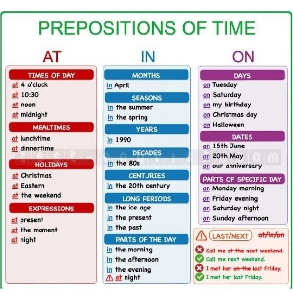 Ngoài ra, giới từ cũng thể hiện thời gian. Ví dụ, “at” được sử dụng để chỉ một thời điểm cụ thể, như trong câu “She usually studies at night” (Cô ấy thường học vào ban đêm). Có nhiều giới từ khác nhau như “in”, “on”, “before”, và “after”, cho phép người nói diễn đạt nhiều ý tưởng khác nhau về thời gian.