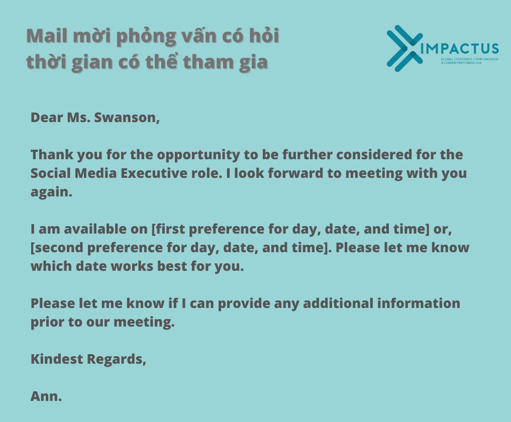 Cuối cùng, kết thúc bức thư bằng một lời chào trân trọng như “Best regards” và đừng quên ký tên của bạn. Việc trả lời thư mời phỏng vấn một cách chu đáo sẽ tạo được ấn tượng tốt với nhà tuyển dụng và thể hiện sự chuyên nghiệp của bạn.