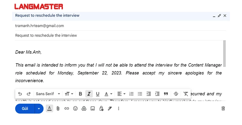 Trong phần nội dung, bạn có thể bắt đầu với câu “I am writing to confirm my acceptance of the interview invitation,” để thể hiện sự chuyên nghiệp. Hãy thể hiện lòng biết ơn của bạn bằng cách nói “I am very grateful for this opportunity.” Đừng quên đề cập rõ ngày giờ và địa điểm phỏng vấn để tránh nhầm lẫn.