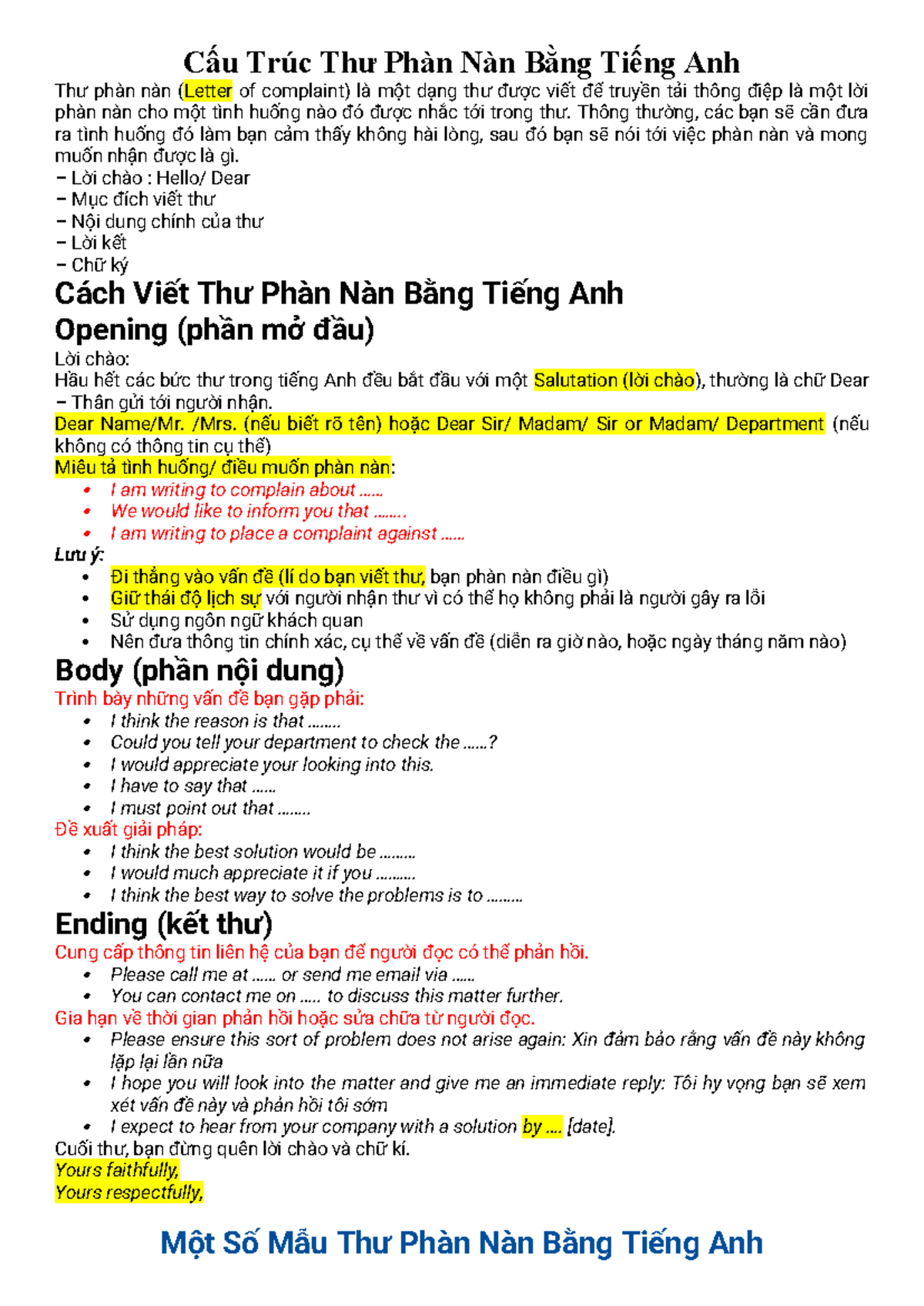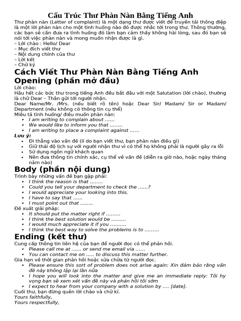 Cấu Trúc Thư Phàn Nàn Bằng Tiếng Anh