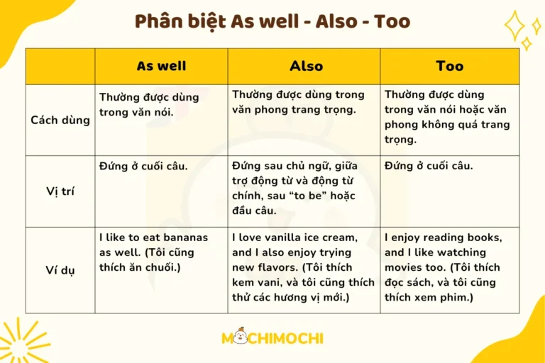 Trong tiếng Anh, “as well as” là một cụm từ quen thuộc nhưng lại dễ gây nhầm lẫn với liên từ “and.” Việc sử dụng đúng “as well as” không chỉ giúp câu nói trở nên tự nhiên, mạch lạc…