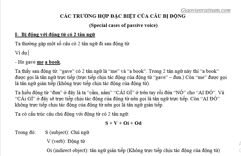Câu bị động là phần kiến thức quan trọng trong tiếng Anh, nhất là với các động từ như “love”, “enjoy”, “regret”, và “admit”. Một ví dụ điển hình cho câu bị động với hai tân ngữ là “She was given a gift by him”, trong đó có sự chuyển đổi giữa tân ngữ và tác nhân thực hiện.