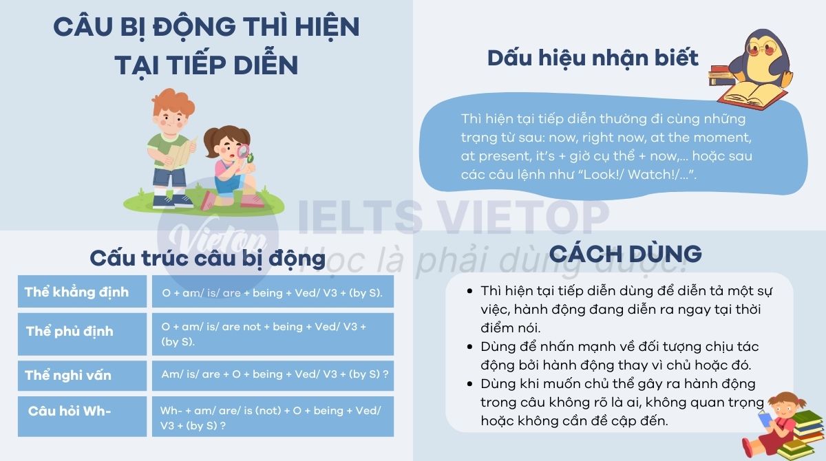 Câu bị động thì hiện tại tiếp diễn là một trong những cấu trúc quan trọng và thường gặp trong tiếng Anh, đặc biệt khi bạn muốn nhấn mạnh hành động đang diễn ra ở hiện tại và đối tượng chịu tác động của hành động đó. Hiểu rõ về cách thành lập, cách sử dụng cũng như dấu hiệu nhận biết của câu bị động thì hiện tại tiếp diễn sẽ giúp bạn giao tiếp và viết tiếng Anh một cách hiệu quả hơn. Bài viết dưới đây sẽ cung cấp cho bạn các kiến thức từ cấu trúc, cách dùng, ví dụ minh họa đến các bài tập thực hành và lưu ý khi sử dụng dạng câu này.