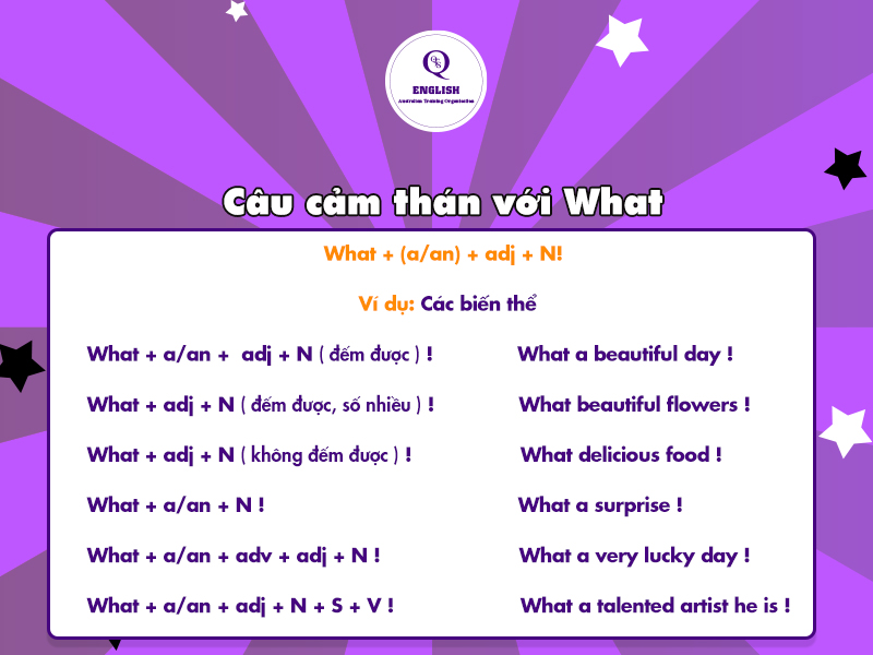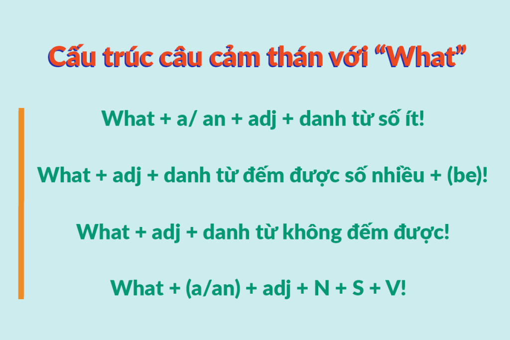 Trong tiếng Anh, câu cảm thán là một phương tiện quen thuộc để bày tỏ cảm xúc như ngạc nhiên, vui mừng hay thích thú. Một trong những cấu trúc cảm thán thường gặp nhất là câu cảm thán với “What”. Việc sử dụng đúng câu cảm thán này không chỉ giúp lời nói tự nhiên, giàu sắc thái hơn mà còn giúp bạn giao tiếp hiệu quả như người bản xứ. Bài viết sau sẽ giúp bạn hiểu rõ về cấu trúc, cách dùng, các ví dụ minh họa sinh động, cũng như phân biệt câu cảm thán với “What” và “How”, kèm bài tập thực hành cụ thể.