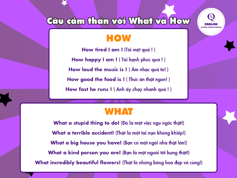 Câu cảm thán là một phần thú vị trong tiếng Anh, giúp chúng ta thể hiện cảm xúc một cách mạnh mẽ hơn. Hai cấu trúc chính của nó là “What” và “How”. Với cấu trúc “What”, chúng ta có thể sử dụng “What + (a/an) + (adjective) + noun” để biểu thị sự ngạc nhiên hoặc ấn tượng mạnh với một sự việc nào đó. Ví dụ, “What a beautiful day!” – câu này thật sự mang lại cảm giác vui tươi.