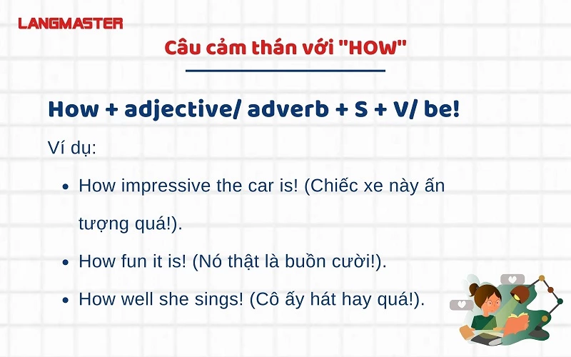 Câu cảm thán trong tiếng Anh là một cách tuyệt vời để bày tỏ cảm xúc và thái độ của chúng ta. Hai mẫu câu phổ biến là với “How” và “What”. Tuy cùng mục đích nhưng chúng có sự khác biệt rõ rệt. Câu cảm thán với “How” thường thể hiện cảm xúc mạnh mẽ, mãnh liệt hơn. Khi sử dụng cấu trúc “How + adjective/adverb + S + V”, như trong câu “How fast you can run!”, người nói cảm thấy ngạc nhiên hoặc khâm phục.