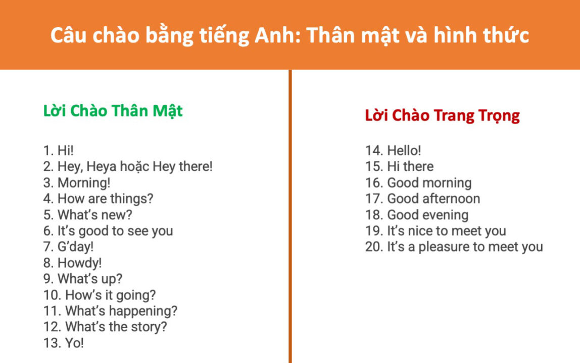 Ngoài ra, có rất nhiều cách chào hỏi khác nhau, từ trang trọng như “How are you?” cho đến những câu lóng như “What’s up?”. Bạn cũng có thể điều chỉnh câu chào của mình tùy theo ngữ cảnh và đối tượng giao tiếp, giúp cuộc trò chuyện trở nên sinh động hơn. Hy vọng những câu chào hỏi này sẽ hữu ích cho bạn!