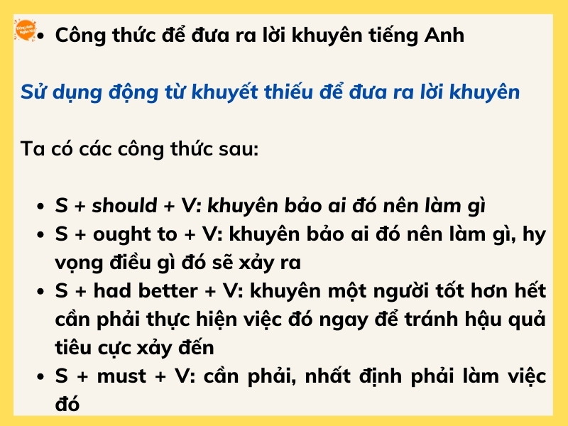 Khi muốn đưa ra lời khuyên trong tiếng Anh, bạn có thể sử dụng từ “advice” hoặc “recommendation.” Một trong những cách phổ biến nhất là sử dụng động từ khuyết thiếu “should” hoặc “ought to”. Đây là những lựa chọn an toàn khi bạn muốn gợi ý điều gì đó cho người khác. Ví dụ như, “You should try to get more rest,” cho thấy bạn đang khuyên họ nên nghỉ ngơi nhiều hơn.