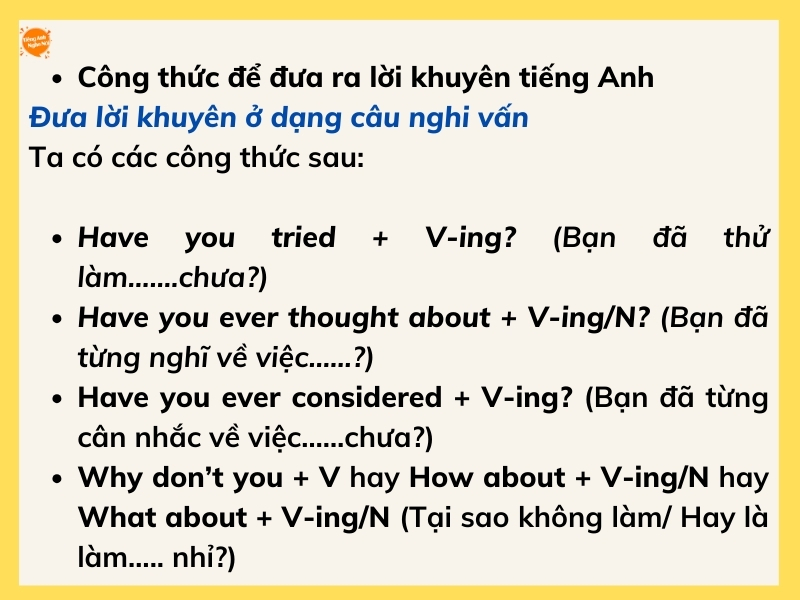 Ngoài việc đưa ra lời khuyên trực tiếp, bạn cũng có thể đặt câu hỏi cho người khác về ý kiến của họ. Hỏi “What do you suggest?” hay “What would you do if you were me?” giúp khuyến khích cuộc trò chuyện và có thể mở ra nhiều lựa chọn hơn.