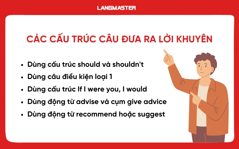 Khi đưa ra lời khuyên, cấu trúc phổ biến nhất là “[Subject] + should + verb-infinitive”. Ví dụ, “I advise you to practice speaking English every day” là một cách đơn giản nhưng hiệu quả để khuyến khích ai đó cải thiện kỹ năng ngôn ngữ của họ. Ngoài ra, bạn có thể dùng câu điều kiện loại 1 với cấu trúc: “If + present simple, …” để đưa ra lời khuyên trong các tình huống cụ thể.