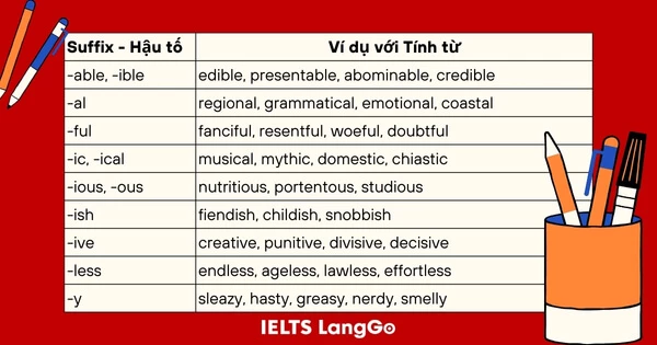 Ngoài ra, còn nhiều cách khác để tạo tính từ. Các danh từ khi thêm các hậu tố như “-ful” hay “-less” cũng cho ra những tính từ có nghĩa rõ ràng, như “beautiful” (xinh đẹp) hoặc “harmless” (vô hại). Hơn nữa, các hậu tố như “-ous” hay “-ish” cũng giúp làm giàu thêm vốn từ vựng, từ “famous” (nổi tiếng) tới “childish” (trẻ con).
