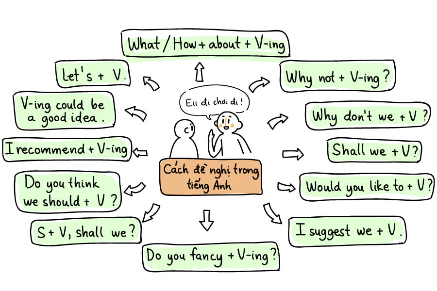 Cấu trúc câu đề nghị trong tiếng Anh rất đa dạng và phong phú, giúp chúng ta gợi ý hay yêu cầu một cách lịch sự. Một số cấu trúc thông dụng nhất bao gồm “Let’s”, “How about”, “What about”, và “Shall we”. Ví dụ, khi muốn rủ ai đó đi chơi, ta có thể nói: “Shall we hang out today?” Câu này không chỉ đơn thuần là một lời mời, mà còn thể hiện sự thân thiện và sự mong muốn được chia sẻ thời gian với người khác.