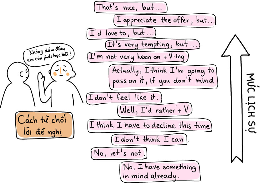 Cuối cùng, việc trả lời lại những lời đề nghị cũng không kém phần quan trọng. Bạn có thể đồng ý với “Sure, let’s go!” hoặc từ chối một cách nhẹ nhàng như “I’m sorry, but I can’t.” Những cụm từ này không chỉ thể hiện sự lịch sự mà còn giúp duy trì mối quan hệ tốt đẹp giữa các bên trong cuộc trò chuyện.
