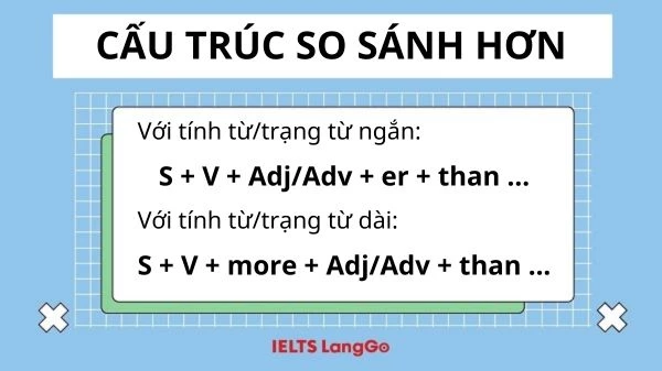Trong tiếng Anh, câu so sánh hơn đóng vai trò quan trọng giúp chúng ta so sánh sự vật, sự việc hoặc con người với nhau một cách rõ ràng và chính xác. Việc sử dụng đúng cấu trúc câu so sánh hơn không chỉ cải thiện kỹ năng viết mà còn giúp giao tiếp hiệu quả hơn. Để nắm vững dạng câu ngữ pháp này, bạn cần tìm hiểu về công thức, quy tắc thêm “-er” vào tính từ, cách dùng với tính từ dài, các dấu hiệu nhận biết, từ bất quy tắc cũng như một số lưu ý khi sử dụng. Bài viết sau sẽ hướng dẫn chi tiết về câu so sánh hơn trong tiếng Anh cùng ví dụ minh họa và bài tập vận dụng.