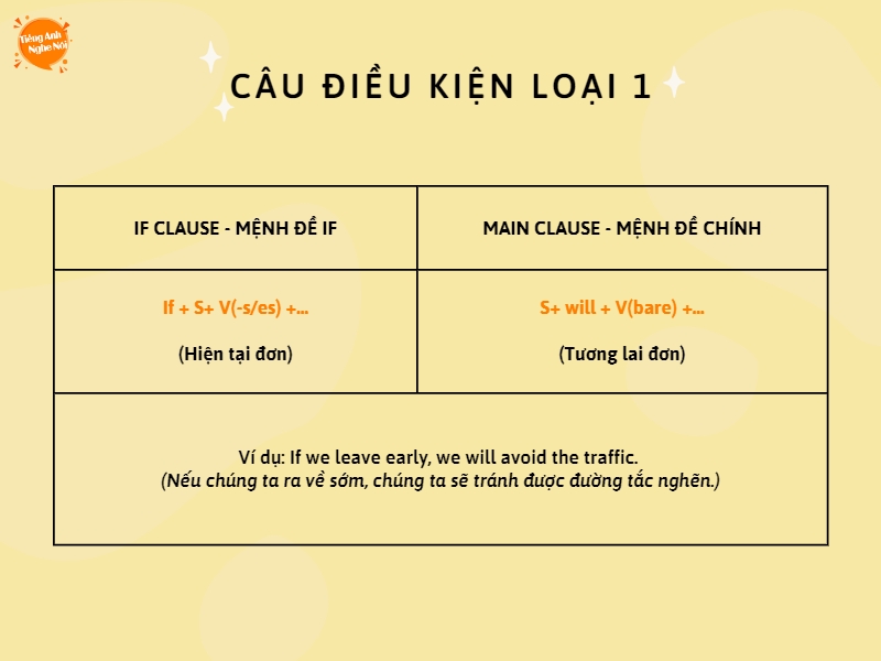 Câu điều kiện loại 1, hay còn gọi là First Conditional, là một cấu trúc ngữ pháp thú vị trong tiếng Anh. Nó được sử dụng khi chúng ta muốn dự đoán một sự việc có khả năng xảy ra trong tương lai, dựa trên một điều kiện nhất định. Cấu trúc này thường gồm hai phần: mệnh đề if và mệnh đề kết quả.