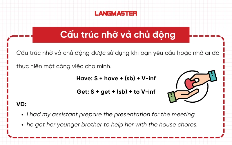 Bên cạnh đó, cấu trúc nhờ vả còn có dạng bị động, dùng để diễn tả những công việc mà người nói không thể hoặc không muốn thực hiện. Ví dụ, “I had my car repaired” (Tôi đã nhờ sửa xe) cho thấy rằng người nói không trực tiếp làm hành động sửa chữa mà đã yêu cầu người khác.