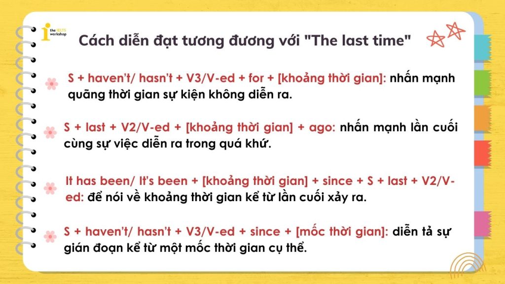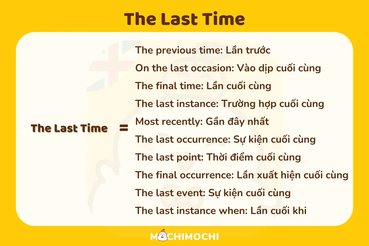 Ngoài ra, cụm từ này còn có nhiều cách diễn đạt gần nghĩa khác như “one last time” hay “most recently”. Những cụm từ này cũng mang tính chất tương tự, chỉ một thời điểm cụ thể trong quá khứ. “The last time” không chỉ đơn thuần là một mốc thời gian, mà còn là một cách để chúng ta nhớ về những điều đã qua và tìm thấy ý nghĩa trong quá trình sống.