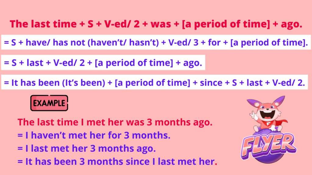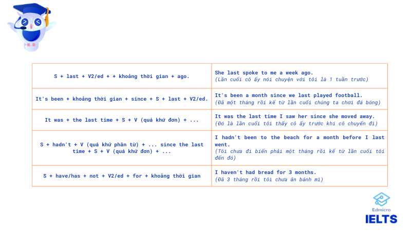 Nếu bạn đang muốn nhắc lại về một điều gì đó đã xa xưa, hãy thử áp dụng cấu trúc này. Đó có thể là lần cuối cùng bạn gặp một người bạn cũ hay tham gia vào một hoạt động yêu thích. “The last time I went hiking was last summer”, và mỗi lần nhắc đến điều đó, bạn sẽ cảm thấy như đang sống lại một ký ức đẹp trong lòng.