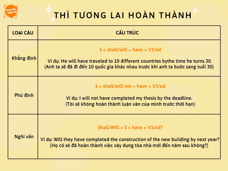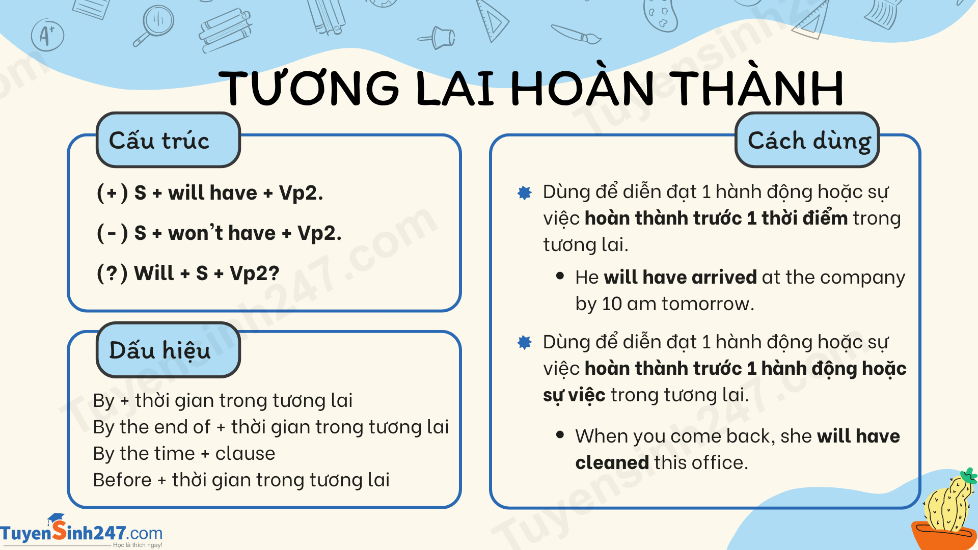 Thì tương lai hoàn thành (Future Perfect) là một trong những thì quan trọng trong tiếng Anh, giúp diễn tả hành động sẽ hoàn thành trước một thời điểm cụ thể trong tương lai. Khi học về thì này, các bạn sẽ nhận thấy rằng nó không chỉ đơn giản là việc chia động từ, mà còn là khả năng xác định và lên kế hoạch cho những việc sẽ xảy ra trong tương lai.