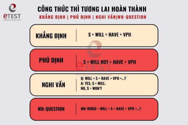 Ngoài dạng khẳng định, thì tương lai hoàn thành còn có cả dạng phủ định và nghi vấn. Đối với dạng phủ định, chúng ta sẽ thêm “not” sau “will” để trở thành “will not have.” Ví dụ, “She will not have completed the project by Friday.” Câu hỏi được hình thành bằng cách đặt “Will” ở đầu câu, như “Will you have graduated by this summer?” và có thể dễ dàng trả lời với “Yes, I will” hoặc “No, I won’t”.
