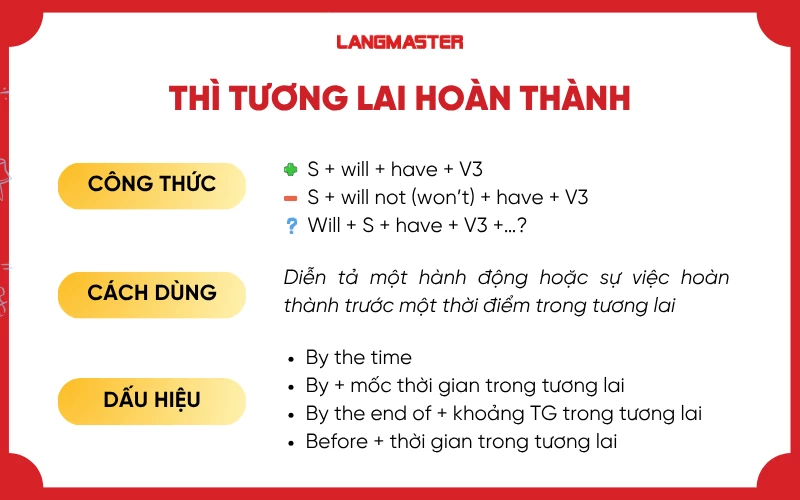 Thì tương lai hoàn thành (Future Perfect Tense) là một công cụ ngôn ngữ rất hữu ích trong tiếng Anh, giúp chúng ta diễn tả những hành động sẽ được hoàn thành trước một thời điểm cụ thể trong tương lai. Công thức chung của thì này là: S + will + have + V3/ed. Chẳng hạn, bạn có thể nói “By 2025, I will have completed my project,” nghĩa là đến năm 2025, bạn sẽ đã hoàn thành dự án của mình.