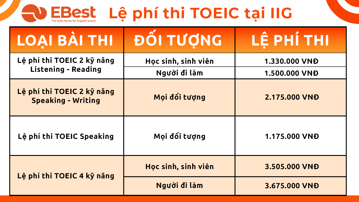 Lệ phí thi TOEIC 4 kỹ năng, bao gồm Nghe, Nói, Đọc và Viết, hiện đang được nhiều thí sinh quan tâm. Đối với những người đang đi làm, lệ phí thi là 3,765,000 VNĐ, trong khi đó, sinh viên và học sinh sẽ được hưởng mức phí ưu đãi hơn là 3,565,000 VNĐ. Đặc biệt, IIG Việt Nam đang có chương trình khuyến mãi dành cho sinh viên, giúp tiết kiệm được 450,000 VNĐ.